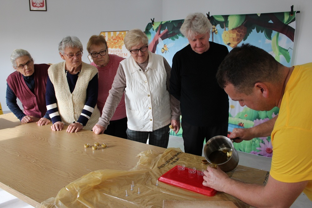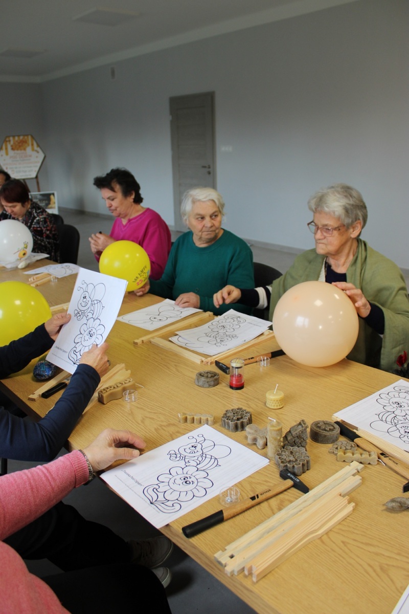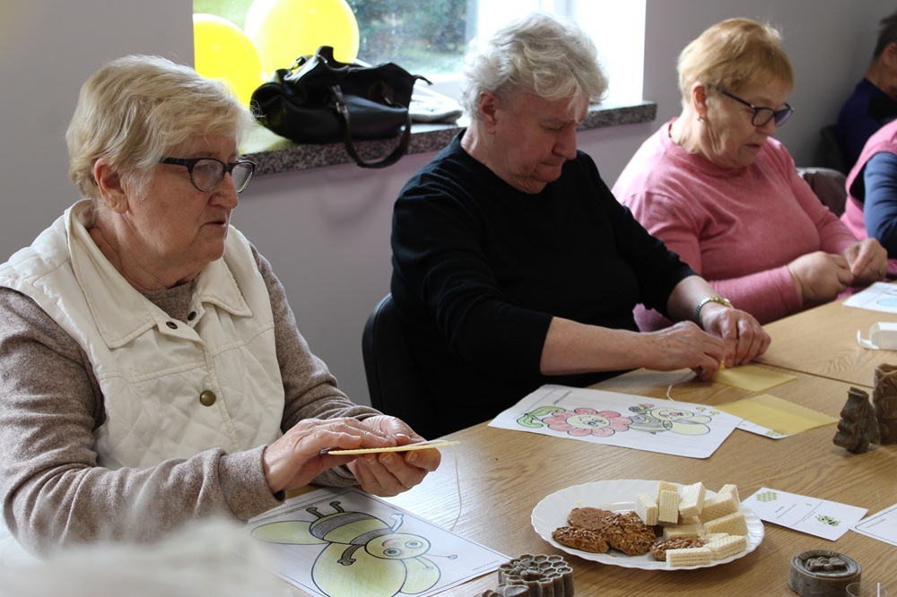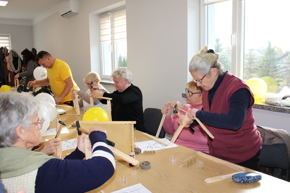 W części praktycznej uczestnicy mieli możliwość wykonania własnych ramek dla pszczół, co pozwoliło im zapoznać się z podstawowymi elementami wyposażenia pasieki i procesem przygotowywania uli do sezonu. Tworzyli również świece z wosku pszczelego, co cieszyło się dużym zainteresowaniem i stanowiło atrakcyjny element zajęć. Zwieńczeniem warsztatów była wizyta degustacja produktów pszczelich oraz wymiana spostrzeżeń i doświadczeń. Gościa specjalnego– Kubusia Puchatka, który wręczył uczestnikom drobne upominki. Ta niespodzianka wywołała wiele radości i była miłym, integrującym akcentem kończącym spotkanie.