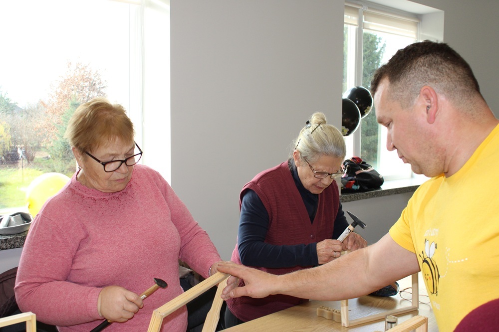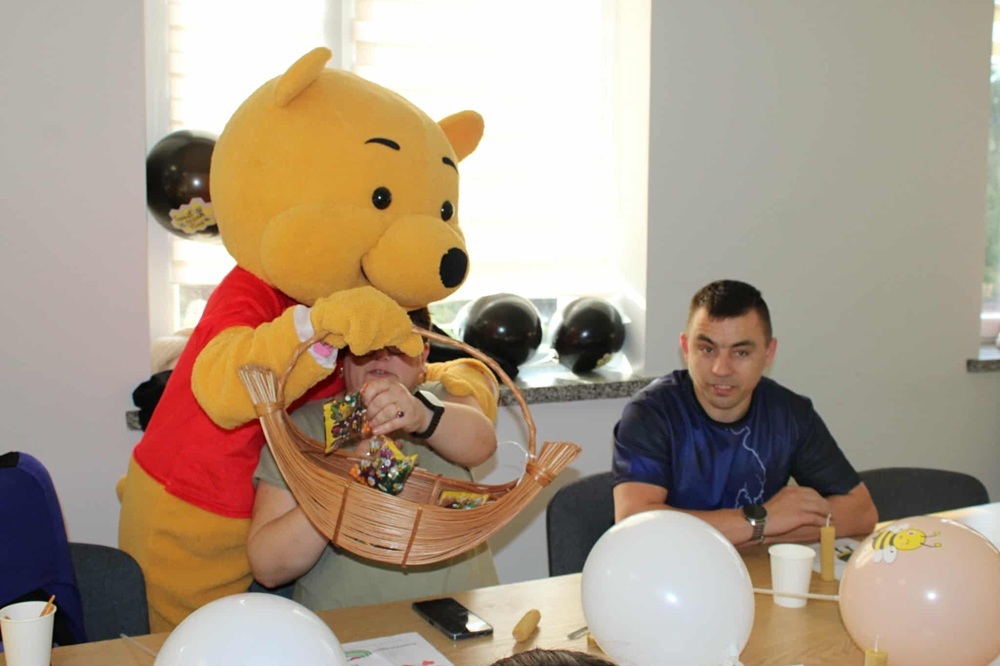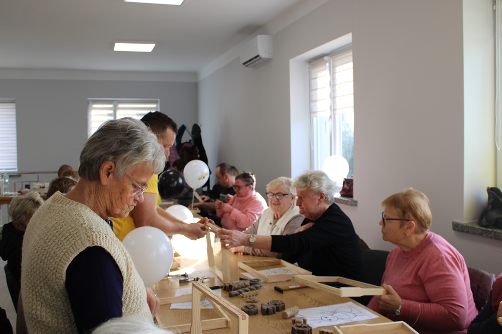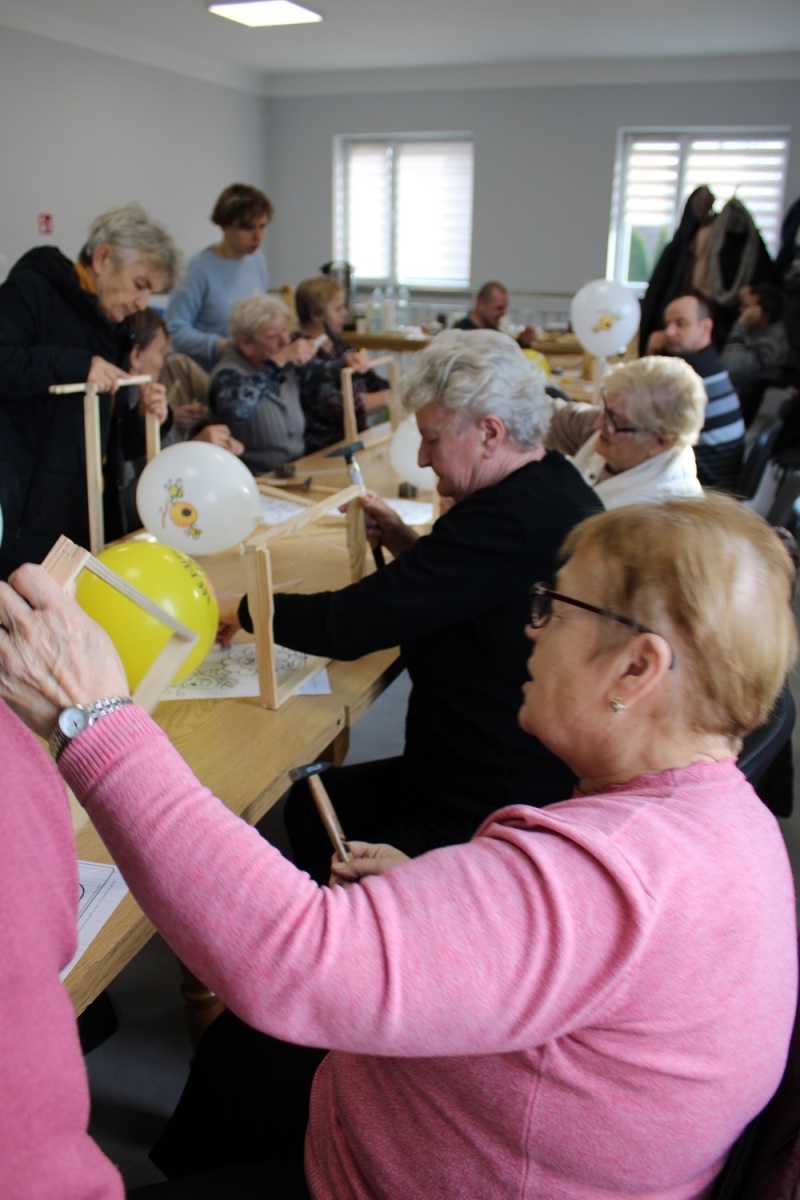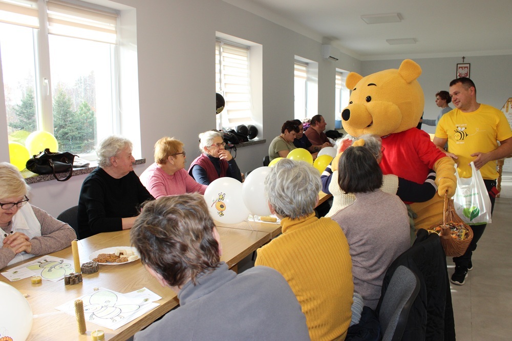 W części praktycznej uczestnicy mieli możliwość wykonania własnych ramek dla pszczół, co pozwoliło im zapoznać się z podstawowymi elementami wyposażenia pasieki i procesem przygotowywania uli do sezonu. Tworzyli również świece z wosku pszczelego, co cieszyło się dużym zainteresowaniem i stanowiło atrakcyjny element zajęć. Zwieńczeniem warsztatów była wizyta degustacja produktów pszczelich oraz wymiana spostrzeżeń i doświadczeń. Gościa specjalnego– Kubusia Puchatka, który wręczył uczestnikom drobne upominki. Ta niespodzianka wywołała wiele radości i była miłym, integrującym akcentem kończącym spotkanie.